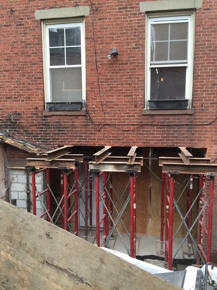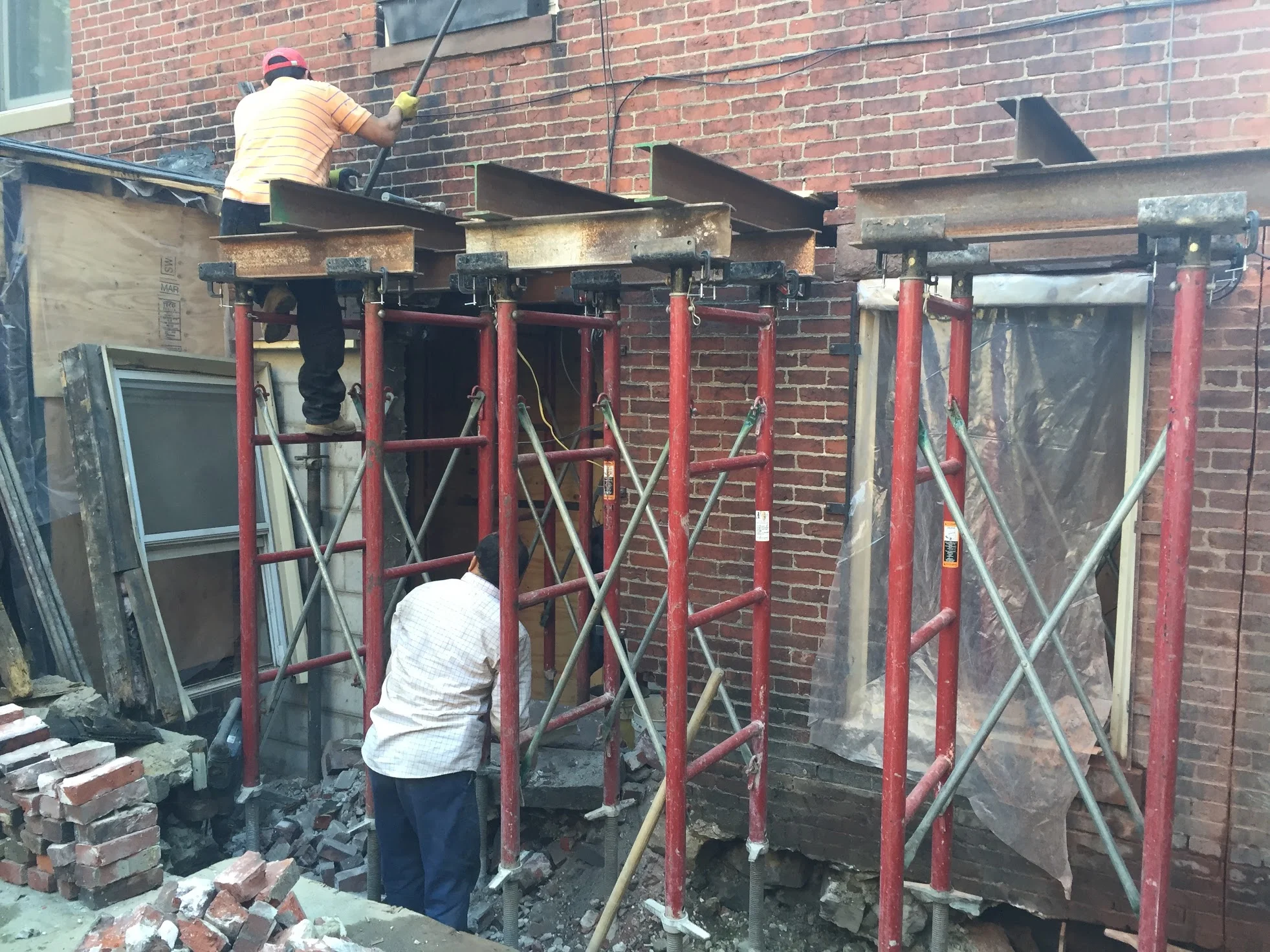 2. Structural support. Turning a brick wall with two windows and a crappy side entrance into a wall of sliding glass doors is just as stupid(ly expensive) as it sounds. First, the contractors, overseen by a structural engineer, put in scaffolding and support beams to bear the load of the entire back side of the house while they worked.